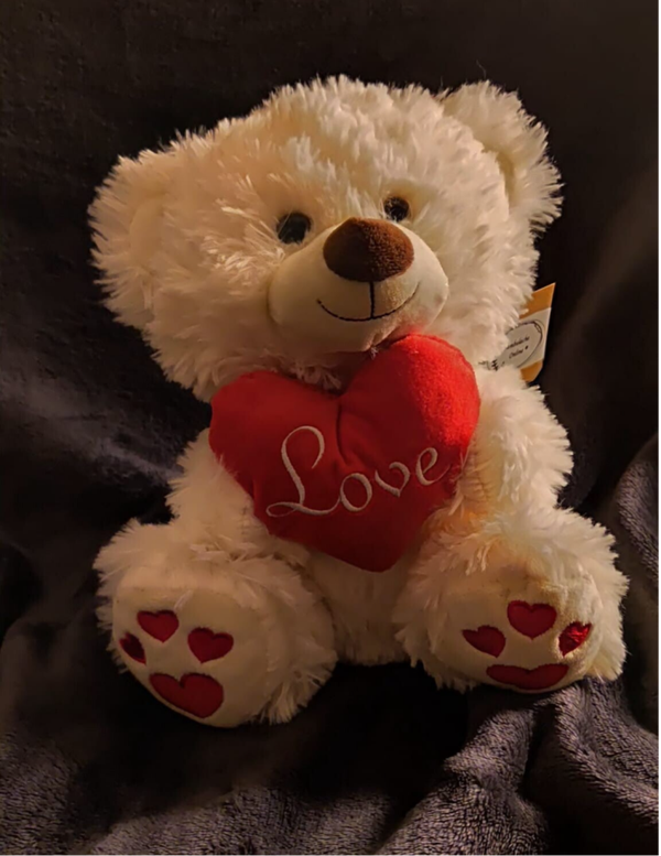 Oso de peluche muy suave con corazón love y corazones en las huellas de las patas (33cm) ,benjamin frances Jp chenet Ice edition, Vela aromática en cristal,Caja de bombones milka (20 bombones) en forma de corazón QR para enviar mensaje, Llavero de peluche suave en forma de corazón con aro y mosquetón en dorado, Juego de pendientes de perla con cierre flexible en su caja de regalo con lazo, Frasco de aroma relajante con varillas para aromatizar ambientes (aroma relajante), Dos bombones premium en su cajita de madera, cesta reutilizable (33x23x14 cm)
