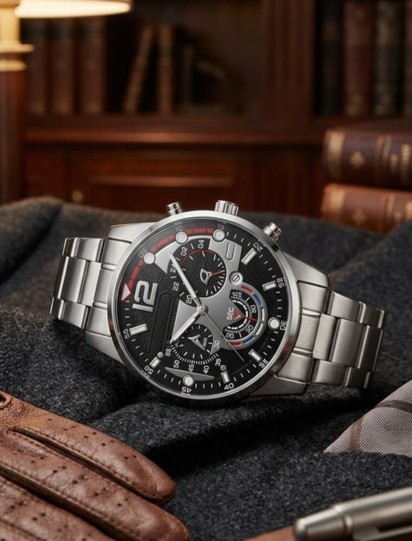 Esfera con detallles en negro y plateado y pequeñas lineas en rojo y azul que componen un diseño fantástico. correa metálica con eslabones.