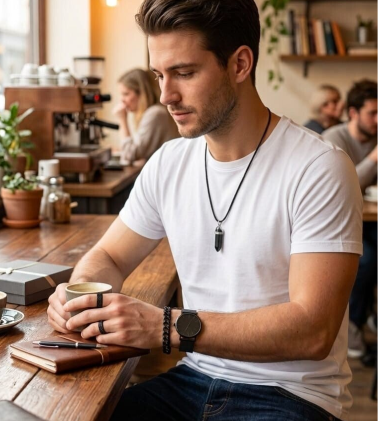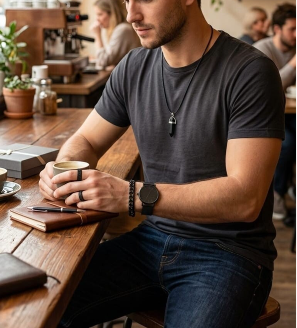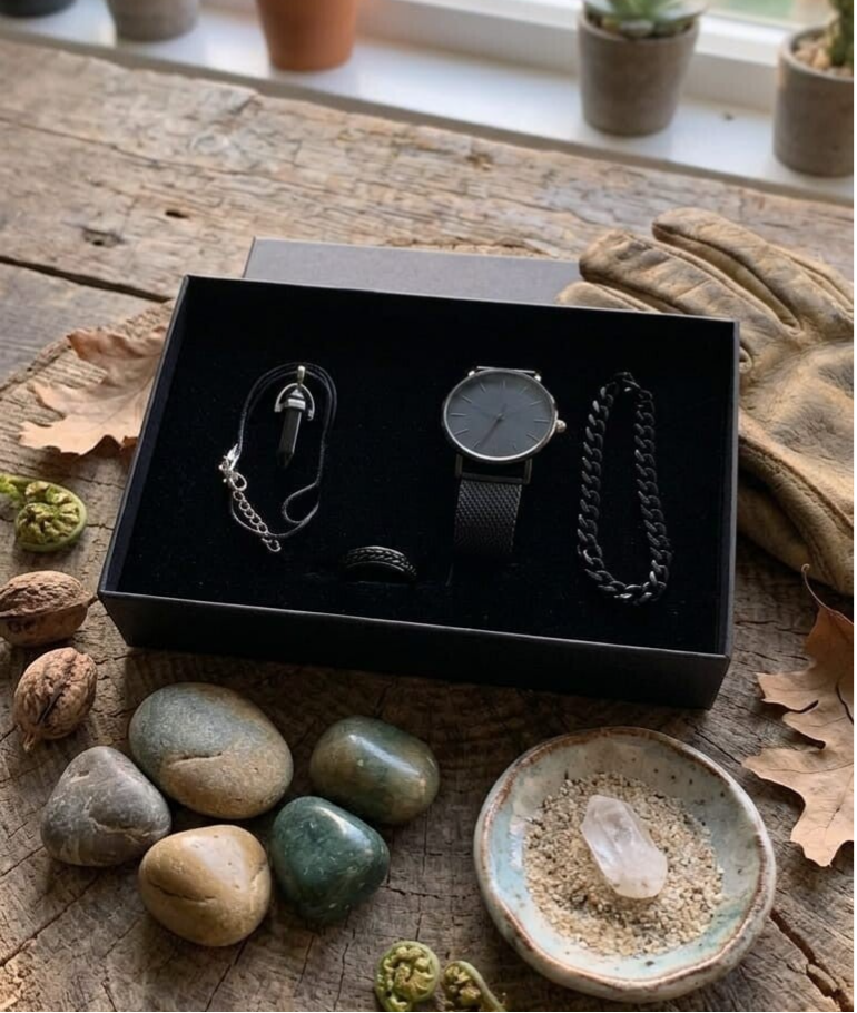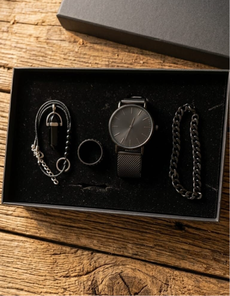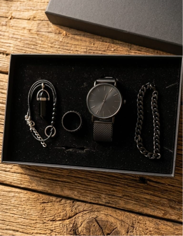 Conjunto Hombre - Reloj negro, pulsera negra, anillo negro labrado y piedra Onix con correa de cuero