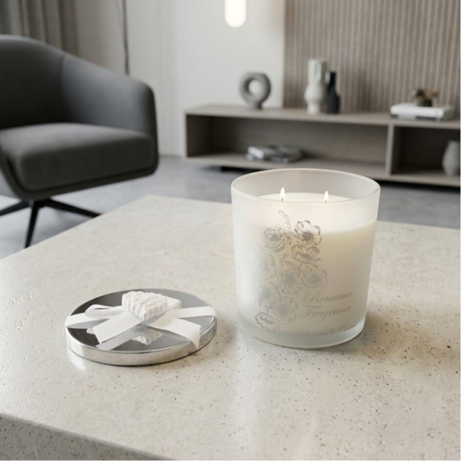 Vela aromática doble mecha (850 gr) en envase de cristal mate, con tapa.