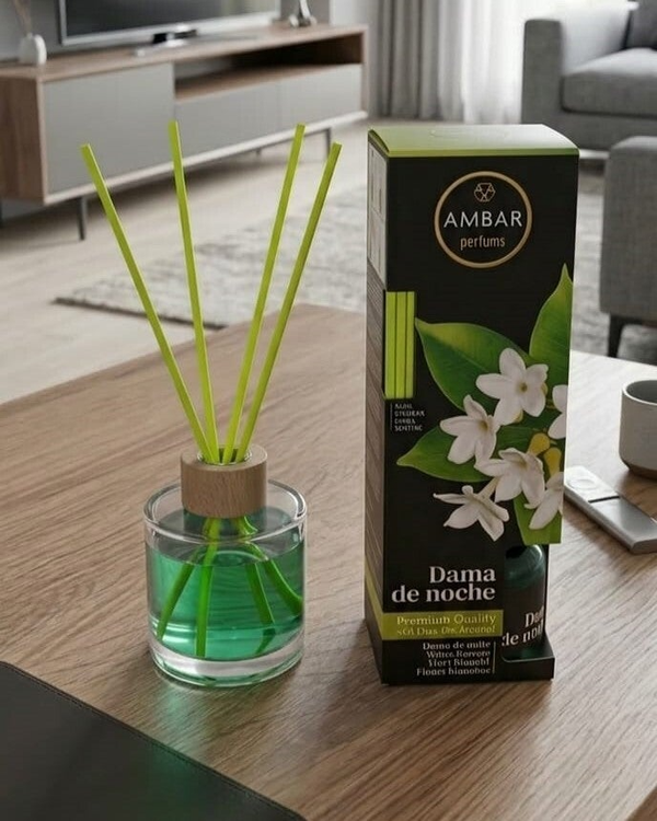 Fragancia premium Dama de noche. con varillas para la dispersion del aroma en el ambiente.
