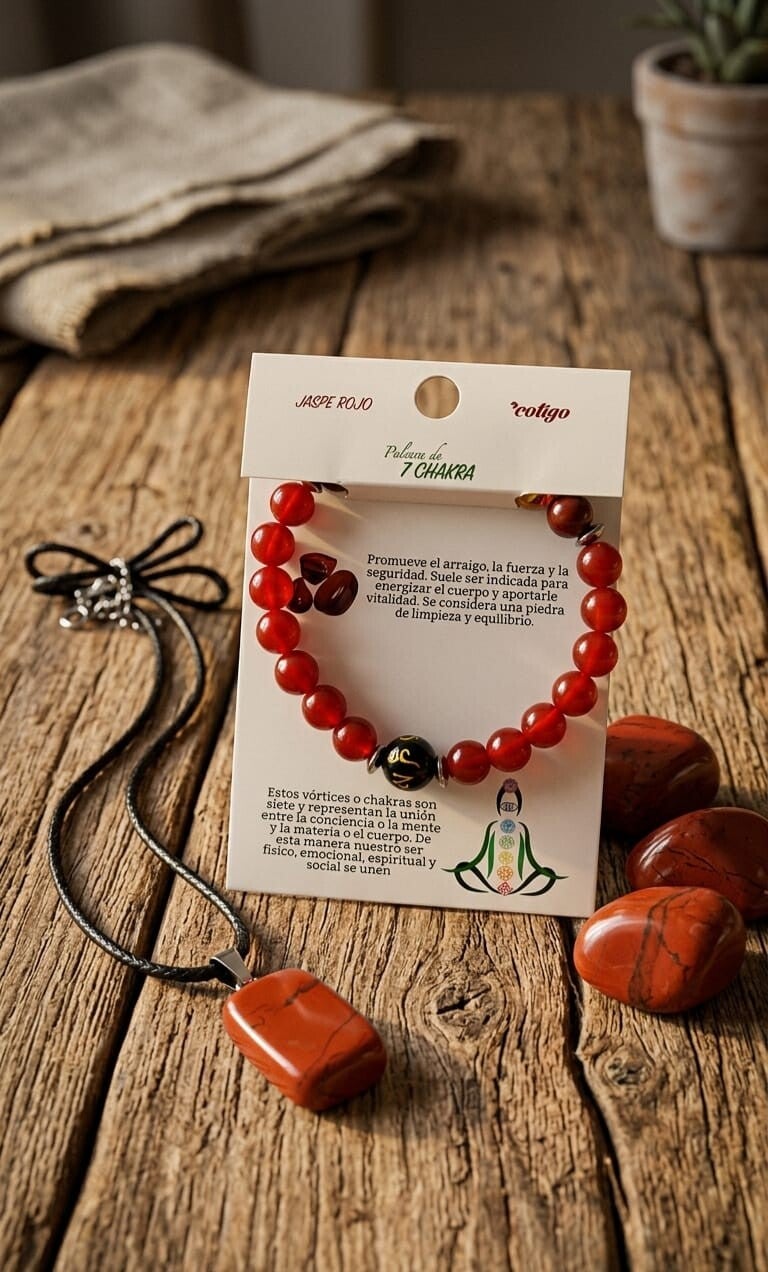 - pulsera siete chacras con piedras de jade rojo y las siete piedras de los siete chacras. Estos vortices o chacra son siete y representan la unión entre la conciencia o la mente y y la materia o el cuerpo. De esta manera nuestro ser físico, emocional, espiritual y social se unen.