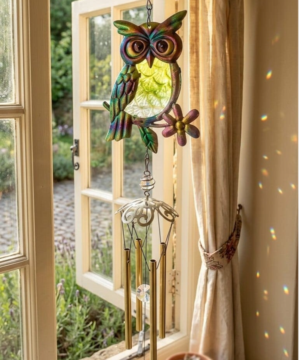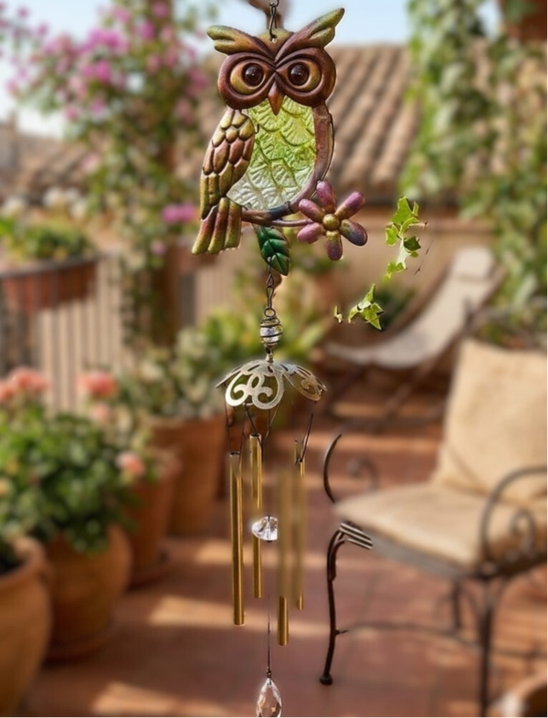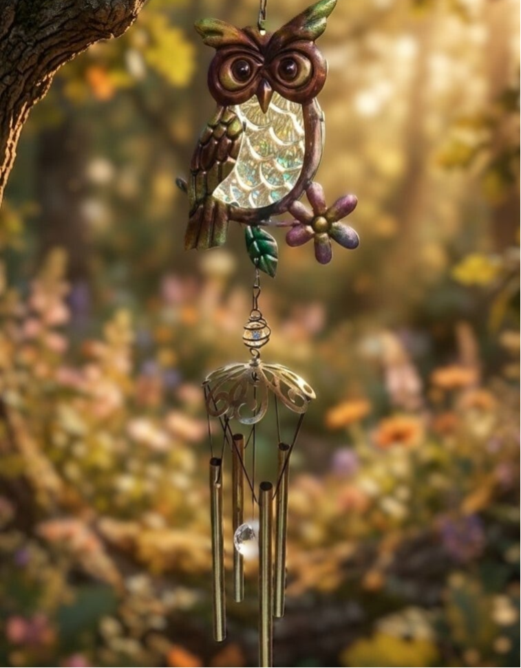 Carrillón con buho y tubos de metal, del centro parte la piedra ambar que cuelga en la parte inferior para poder mover los tubos y conseguir el sonido relajante y Zen. Lleva un enganche tipo percha pequeña en la parte superior para poder colocarlo en una ventana, jardín, terraza ...