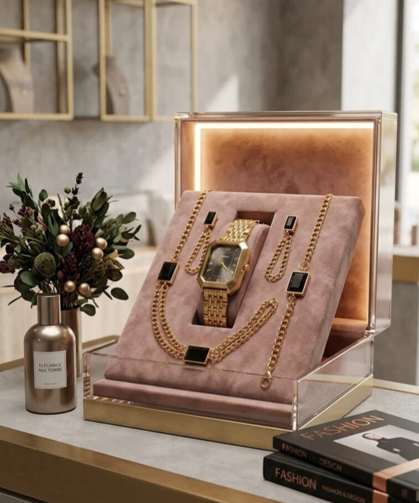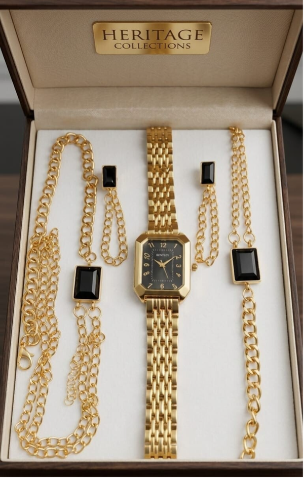 Contiene; RELOJ, CADENA CON COLGANTE, PENDIENTES Y PULSERA.